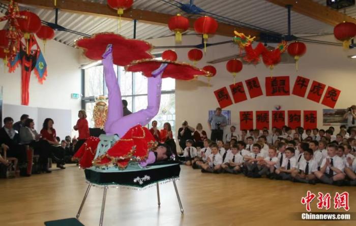 2008年3月,英国艾森学院小学部专门举办庆鼠年“中国日”。中国杂技表演让小学生们啧啧称奇。李鹏摄